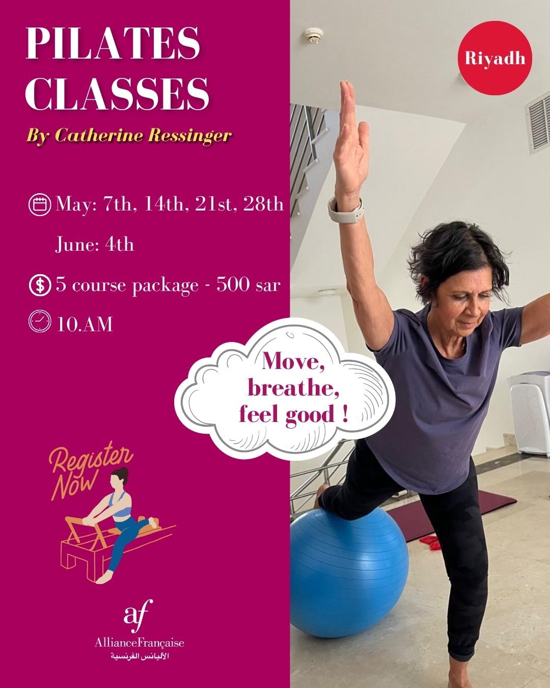 Led by Catherine Ressinger, a certified Pilates instructor passionate about body mind balance.